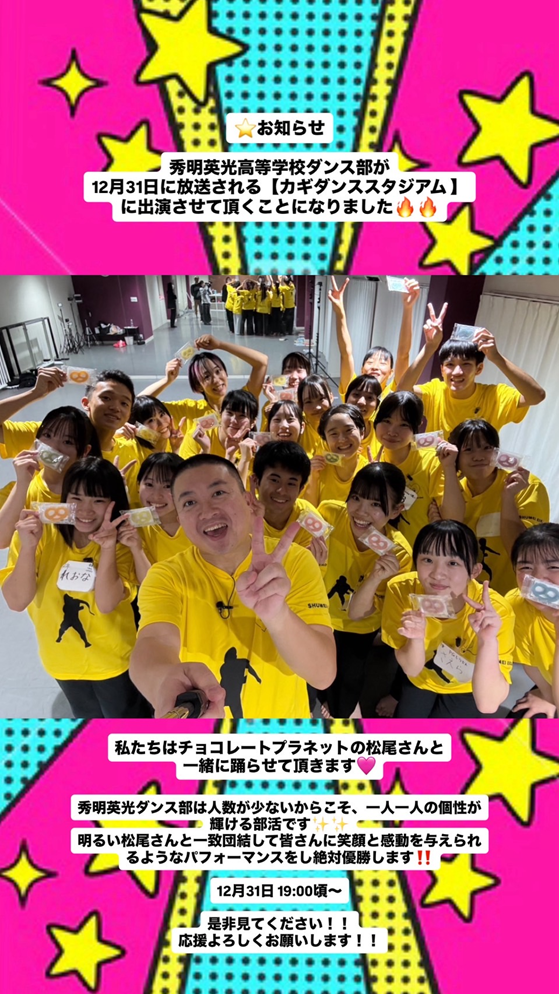 本校ダンス部は、12月31日(水)フジテレビで生放送される「新しいカギ 年末またぎSP」内の「カギダンススタジアム」に出演します。チョコレートプラネットの松尾さんと共にダンスを披露し、全国放送という大きな舞台に挑みます。