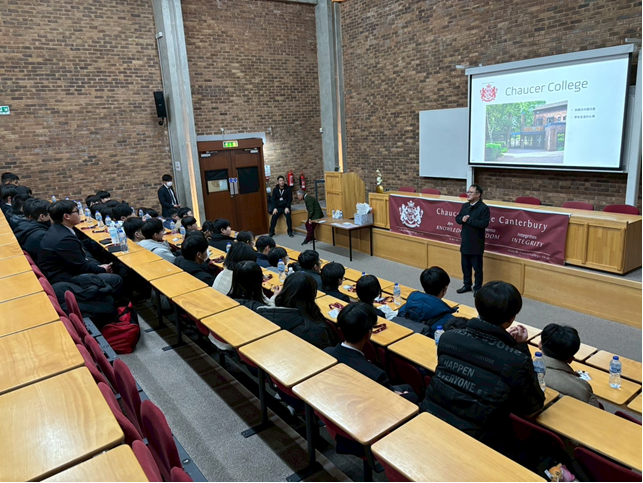 イギリスのヒースロー空港に現地時間の午後3時頃に到着。その後バスでカレッジのあるカンタベリーに移動しました。カレッジ到着後、CCC(チョーサー・カレッジ・カンタベリー)の堀井学長から施設の説明を受けました。