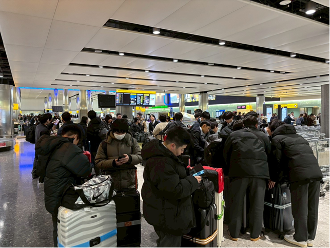 1月7日(水)、イギリス英語研修に1年生(41名)が出発しました。生徒は午前7時に羽田空港の第2ターミナル3F出発ロビーに集合し、JTB担当者から出発までの注意事項を聞いた後、搭乗手続きを済ませました。